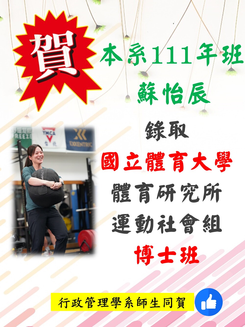 恭喜本系研究所111年班蘇怡辰錄取「國立體育大學體育研究所運動社會組」博士班