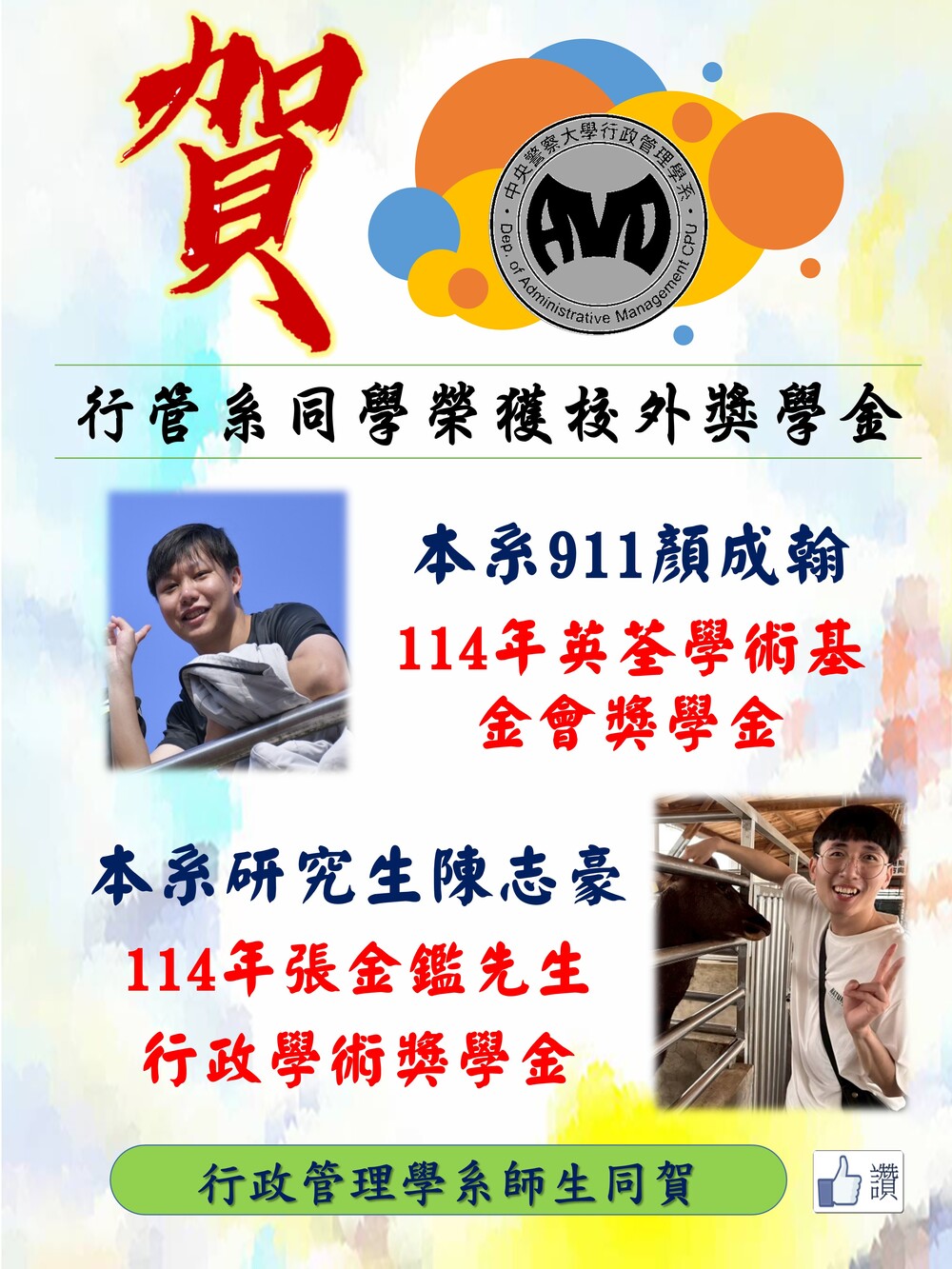 恭喜本系學生榮獲114年校外財團法人英荃學術基金會以及財團法人張金鑑先生行政學術獎學基金會獎學金!
